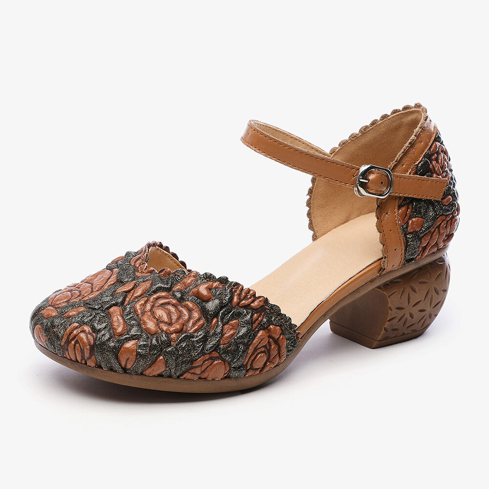 Retro Leather Embossed Floral Buckle Ankle Strap Block Heel D'orsay Pumps