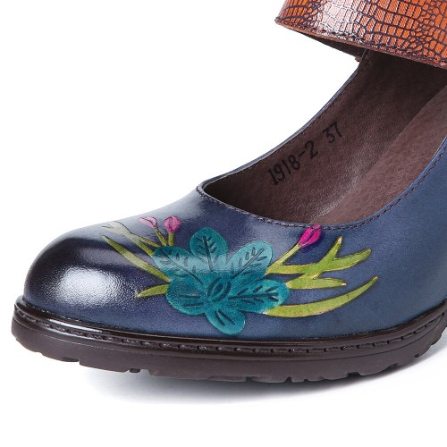 Retro Painting Style Flower Decorated Delicate Buckle Genuine Leather Pumps